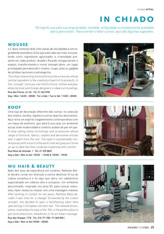 Após dez anos de experiência em Londres, Nathalie Belle decidiu rumar em direcção a outros destinos! A luz de Lisboa encantou-a e foi aqui que abriu um cabeleireiro especializado em cabelos afro e europeus. Um ambiente descontraído, inspirado nos anos 50, para colocar extensões, fazer rastas ou relaxar com uma massagem indiana. After working in London for ten years, Nathalie Belle decided it was time for a change! Enchanted by the Lisbon sunlight, she decided to open a hairdressing salon here specialising in European and afro hair. The relaxed atmosphere, inspired by the style of the ‘50s, is the perfect place to get some extensions, dreadlocks or for an Indian massage. Rua das Chagas, 17 B · Tel. 210 171 358 / 91 860 8561 Seg a Sáb / Mon to Sat 10h00 - 20h00 chiado con vida · 25