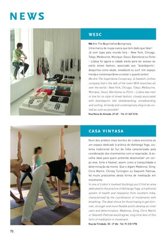 casa vinyasa Num dos prédios mais bonitos de Lisboa encontra-se um espaço dedicado à prática do Ashtanga Yoga, sistema tradicional do Sul da Índia caracterizado pela coordenação dos movimentos com a respiração. A escolha ideal para quem pretende desenvolver um corpo leve, forte e flexível, assim como a tranquilidade e determinação da mente. Que o digam Madonna, Sting, Chris Martin, Christy Turlington ou Gwyneth Paltrow, há muito praticantes desta forma de meditação em movimento. In one of Lisbon’s loveliest buildings you’ll find an area dedicated to the practice of Ashtanga Yoga, a traditional system of health and relaxation from southern India, characterised by the coordination of movements with breathing. The ideal choice for those hoping to get slimmer, stronger and more flexible and to develop an inner calm and determination. Madonna, Sting, Chris Martin or Gwyneth Paltrow would agree, long time fans of this form of meditation in movement. Rua da Trindade, 30 - 3º dto · Tel. 91 218 1778