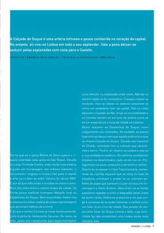 uma refeição na esplanada onde serve. Aborda-os até em inglês se for necessário. O espaço revela-se modesto, mas as mesas no exterior assumem-se como um verdadeiro luxo na capital. Dali os olhos abarcam o Castelo de São Jorge na sua totalidade e os clientes sentam-se em jeito de plateia como se de um espectáculo a vista da cidade se tratasse. Assim seduzem as Escadinhas do Duque, como vulgarmente são chamadas. Na verdade, as placas toponímicas denunciam que aquela artéria tortuosa se chama Calçada do Duque. Situada nas traseiras do Chiado, contrasta com a nobreza que caracteriza o bairro. Porém, ali respira-se Lisboa e vive-se Diz-se que só a igreja Madre de Deus supera a ri-