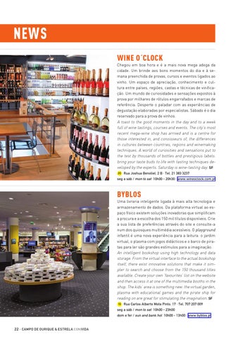 news WINE O´CLOCK Chegou em boa hora e é a mais nova mega adega da cidade. Um brinde aos bons momentos do dia e à semana preenchida de provas, cursos e eventos ligados ao vinho. Um espaço de apreciação, conhecimento e cultura entre países, regiões, castas e técnicas de vinificação. Um mundo de curiosidades e sensações expostos à prova por milhares de rótulos engarrafados e marcas de referência. Desperte o paladar com as experiências de degustação elaboradas por especialistas. Sábado é o dia reservado para a prova de vinhos. A toast to the good moments in the day and to a week full of wine tastings, courses and events. The city’s most recent mega-wine shop has arrived and is a centre for those interested in, and conoisseurs of, the differences in cultures between countries, regions and winemaking techniques. A world of curiosities and sensations put to the test by thousands of bottles and prestigious labels. bring your taste buds to life with tasting techniques developed by the experts. Saturday is wine-tasting day. SF 2G