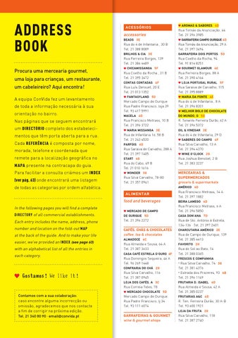 Address Book Procura uma mercearia gourmet, uma loja para crianças, um restaurante, um cabeleireiro? Aqui encontra! A equipa ConVida fez um levantamento de toda a informação necessária à sua orientação no bairro. Nas páginas que se seguem encontrará um directório completo dos estabelecimentos que têm porta aberta para a rua. Cada referência é composta por nome, morada, telefone e coordenada que remete para a localização geográfica no mapa presente na contracapa do guia. Para facilitar a consulta criámos um index (ver pág. 63) onde encontrará uma listagem