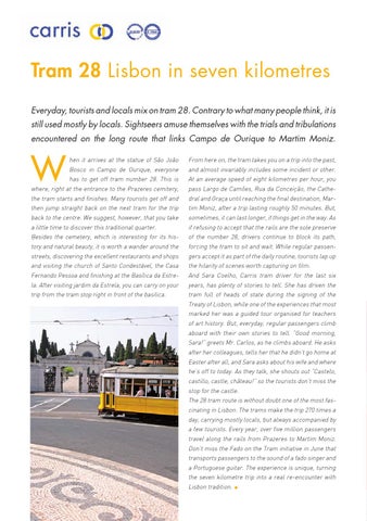 tram full of heads of state during the signing of the Treaty of Lisbon, while one of the experiences that most marked her was a guided tour organised for teachers of art history. But, everyday, regular passengers climb aboard with their own stories to tell. “Good morning, Sara!” greets Mr. Carlos, as he climbs aboard. He asks after her colleagues, tells her that he didn’t go home at Easter after all, and Sara asks about his wife and where he’s off to today. As they talk, she shouts out “Castelo, castillo, castle, château!” so the tourists don’t miss the stop for the castle. The 28 tram route is without doubt one of the most fascinating in Lisbon. The trams make the trip 270 times a day, carrying mostly locals, but always accompanied by a few tourists. Every year, over five million passengers travel along the rails from Prazeres to Martim Moniz. Don’t miss the Fado on the Tram initiative in June that transports passengers to the sound of a fado singer and a Portuguese guitar. The experience is unique, turning the seven kilometre trip into a real re-encounter with Lisbon tradition. •