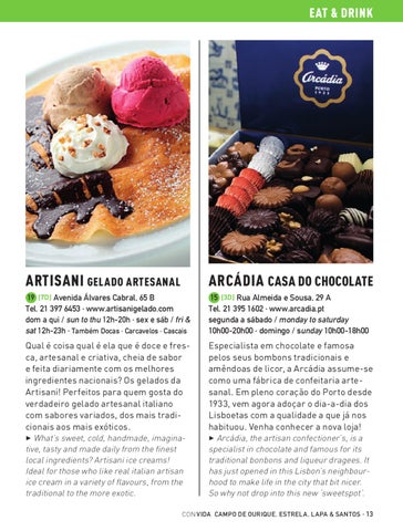 Especialista em chocolate e famosa pelos seus bombons tradicionais e amêndoas de licor, a Arcádia assume-se como uma fábrica de confeitaria artesanal. Em pleno coração do Porto desde 1933, vem agora adoçar o dia-a-dia dos Lisboetas com a qualidade a que já nos habituou. Venha conhecer a nova loja! 3 Arcádia, the artisan confectioner’s, is a