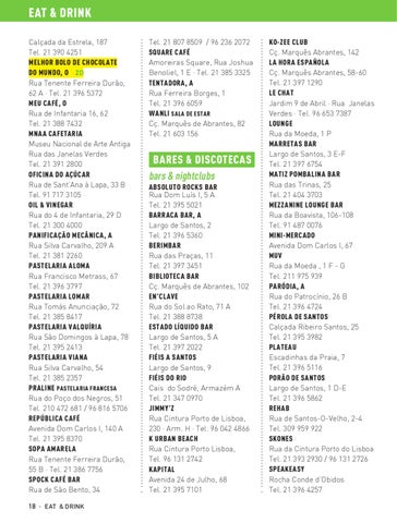 EAT & DRINK Calçada da Estrela, 187 Tel. 21 390 4251 MELHOR BOLO DE CHOCOLATE DO MUNDO, O 2D Rua Tenente Ferreira Durão, 62 A · Tel. 21 396 5372 MEU CAFÉ, O Rua de Infantaria 16, 62 Tel. 21 388 7432 MNAA CAFETARIA Museu Nacional de Arte Antiga Rua das Janelas Verdes Tel. 21 391 2800 OFICINA DO AÇÚCAR Rua de Sant’Ana à Lapa, 33 B Tel. 91 717 3105 OIL & VINEGAR Rua do 4 de Infantaria, 29 D Tel. 21 300 4000 PANIFICAÇÃO MECÂNICA, A Rua Silva Carvalho, 209 A Tel. 21 381 2260 PASTELARIA ALOMA Rua Francisco Metrass, 67 Tel. 21 396 3797 PASTELARIA LOMAR Rua Tomás Anunciação, 72 Tel. 21 385 8417 PASTELARIA VALQUÍRIA Rua São Domingos à Lapa, 78 Tel. 21 395 2413 PASTELARIA VIANA Rua Silva Carvalho, 54 Tel. 21 385 2357 PRALINE PASTELARIA FRANCESA Rua do Poço dos Negros, 51 Tel. 210 472 681 / 96 816 5706 REPÚBLICA CAFÉ Avenida Dom Carlos I, 140 A Tel. 21 395 8370 SOPA AMARELA Rua Tenente Ferreira Durão, 55 B · Tel. 21 386 7756 SPOCK CAFÉ BAR Rua de São Bento, 34 18 · EAT & DRINK
