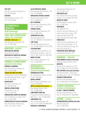 Estrada dos Prazeres, 93 Tel. 21 396 1149 FRUTARIAS A&C Rua Tenente Ferreira Durão, 30 A-B · Tel. 93 600 1921 /07 MAÇÃS DE ADÃO Rua Almeida e Sousa, 60 A Tel. 21 387 0661 MINIPREÇO Tel. 808 200 795 • Rua Francisco Metrass, 75 • Rua Sant’Ana à Lapa, 150 • Rua de São Paulo, 80 • Rua Saraiva Carvalho, 254 PINGO DOCE • Rua Francisco Metrass, 36 • Rua Ferreira Borges, 14 C • Rua de Sant’Ana à Lapa, 56 • Rua do Quelhas, 8 PRIMAVERA MINI-MERCADO Calçada da Estrela, 179