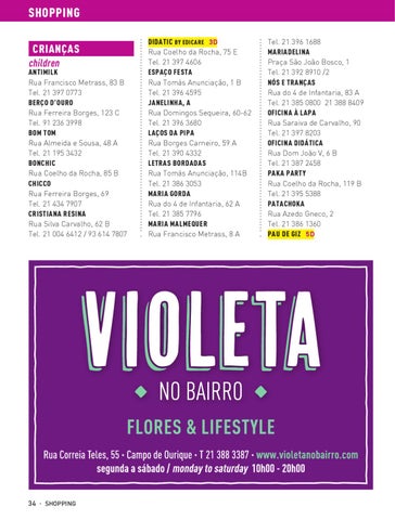 Tel. 21 396 1688 MARIADELINA Praça São João Bosco, 1 Tel. 21 392 8910 /2 NÓS E TRANÇAS Rua do 4 de Infantaria, 83 A Tel. 21 385 0800 21 388 8409 OFICINA À LAPA Rua Saraiva de Carvalho, 90 Tel. 21 397 8203 OFICINA DIDÁTICA Rua Dom João V, 6 B Tel. 21 387 2458 PAKA PARTY Rua Coelho da Rocha, 119 B Tel. 21 395 5388 PATACHOKA Rua Azedo Gneco, 2 Tel. 21 386 1360 PAU DE GIZ 5 D