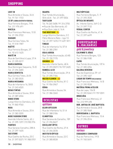 SHOPPING LOST IN Rua Almeida e Sousa, 34 A Tel. 91 741 1733 LX DF LISBOA DISTRITO FEDERAL Rua Ferreira Borges, 79 A Tel. 211 974 691 MACELA Rua Francisco Metrass, 10 B Tel. 21 396 3722 MADAME Rua Correia Teles, 54 Tel. 91 518 1987 MAÏTTÈ Rua Ferreira Borges, 37 Tel. 92 613 1425 MAITÊ IN Rua de Sant’Ana à Lapa, 37 A Tel. 21 395 0217 MARIA BARRIGA Rua Domingos Sequeira, 74 B Tel. 21 396 3680 MARIA BEMFEITA Rua Correia Teles, 24 B Tel. 21 383 0535 MARIA MISSANGA Rua de Infantaria 16, 58 B Tel. 21 243 4520 MEIAS TINTAS Rua Almeida e Sousa, 30 A Tel. 21 387 4506 MOOD STORE Largo Vitorino Damásio, 2 A Tel. 91 860 9760 NAIA Rua Almeida e Sousa, 20 A Tel. 21 383 3205 NUDE FASHION STORE Avenida Infante Santo, 60 J Tel. 21 395 1297 / 93 983 976 PARFOIS Rua Saraiva Carvalho, 288 A Tel. 21 397 1405 SAX STORE Rua Coelho da Rocha, 25 C Tel. 21 397 5227 / 91 988 0701 38 · SHOPPING