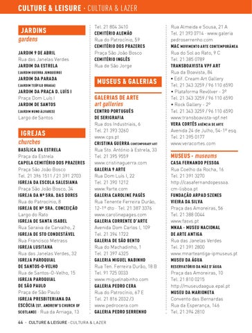 CENTRO PORTUGUÊS DE SERIGRAFIA Rua dos Industriais, 6 Tel. 21 393 3260 www.cps.pt CRISTINA GUERRA CONTEMPORARY ART Rua Sto. António à Estrela, 33 Tel. 21 395 9559 www.cristinaguerra.com GALERIA 9 ARTE Rua Dom Luís I, 22 Tel. 21 390 1212 www.9arte.com GALERIA CAROLINE PAGÈS Rua Tenente Ferreira Durão, 12-1º dto · Tel. 21 387 3376 www.carolinepages.com GALERIA CORRENTE D’ARTE Avenida Dom Carlos I, 109 Tel. 21 394 1722 GALERIA DE SÃO BENTO Rua do Machadinho, 1 Tel. 21 397 4325 GALERIA MIGUEL NABINHO Rua Ten. Ferreira Durão, 18 B Tel. 91 725 0033 www.miguelnabinho.com GALERIA PEDRO CERA Rua do Patrocínio, 67 E Tel. 21 816 2032 /3 www.pedrocera.com GALERIA PEDRO SERRENHO