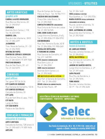 UTILIDADES · UTILITIES ARTES GRÁFICAS graphic arts CABRAL & ALVES DOURADOR Rua Marcos Marreiros, 22 Tel. 21 390 8767 COPIANÇO Avenida Dom Carlos I, 118 Tel. 96 400 5900 GABRIEL LDA. Rua do 4 de Infantaria, 28 B Tel. 21 384 4297 JA BARROS Trav. Nova de Santos, 31 - 33 Tel. 21 396 9592 OFICINA DO PAPEL CENTRO DE CÓPIAS E SERVIÇOS Rua Correia Teles, 28 A Tel. 21 383 8239 / 91 879 7581 PRETO NO BRANCO Rua de São Paulo, 39 - 41 Tel. 21 342 0273