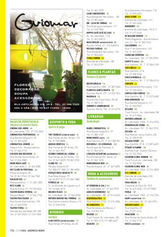 Rua Alexandre Herculano, 7 B Tel. 21 099 6201 BOSS STORE 5G Avenida da Liberdade, 141 Tel. 21 343 3664 BURBERRY 5F Avenida da Liberdade, 196 E-F Tel. 21 317 4444 BY MALENE BIRGER 1C Páteo Bagatella · Rua Artilharia Um, 51 · Tel. 21 383 3142 CALZEDONIA 6J Rua 1º de Dezembro, 143 Tel. 21 343 3269 CAROLINA HERRERA 5G Av. Liberdade, 150 · 21 325 9294 CHIFFI’S (CASTIL) 2D Rua Castilho, 39 · T. 21 386 3139 COCCINELLE 2E Rua Castilho, 27 A Tel. 21 358 2266 COCO & BENGALA 2D Rua Castilho, 50 · T. 21 386 4214 COMCOR 4D Rua Alexandre Herculano, 11 E Tel. 21 330 4024 CONTAS SÃO CONTAS 2D Rua Castilho, 50 · T. 91 227 4382 DON GORGORÃO 5E Rua Barata Salgueiro, 2 C Tel. 21 352 0321 ÉCLAIRE 5G Tivoli Forum - Av. Liberdade,180 Tel. 91 617 1824 EMPORIO ARMANI 4E Av. Liberdade, 220A · 21 314 0743 ERMENEGILDO ZEGNA 5G Av. Liberdade, 151 · 21 343 3710 ESCADA 5F Rua Manuel Jesus Coelho, 4B Tel. 21 355 8128 ESCADA SPORT 2D Rua Castilho, 57 B · 21 387 6639 ETXART & PANNO 1B Avenida Engº. Duarte Pacheco Tel. 21 722 3963 FASHION CLINIC WOMEN 5G Tivoli Forum-Av. Liberdade, 180 Tel. 21 354 9040 FASHION CLINIC MEN 5F Av. Liberdade, 192A · 21 314 2828 FLY LONDON 4E Avenida da Liberdade, 230 Tel. 96 213 1705 FUGA DÓLEO 5I Travessa do Fala-Só, 15 E Tel. 96 432 6534 / 91 677 5585 FURLA 5F Av. Liberdade, 196E · 21 316 2726 GANT FLAGSHIP STORE 5H Av. Liberdade, 38 · 21 343 3276 GERARD DAREL 2C Rua Castilho, 69 Tel. 21 371 4141 GRACIDINI 7J Rua Portas de Santo Antão, 60 Tel. 21 346 7115 GUCCI (ACESSORIES) 5G