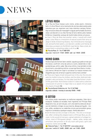 Aos sótãos estão reservados os melhores segredos. Este não é excepção. Subidas as escadas mais íngremes do Príncipe Real deparamo-nos, ao som de jazz, com uma óptima selecção de peças de mobiliário vintage, na sua maioria, design português - mesas, sofás, candeeiros ou cadeirões únicos que prometem graça, espírito e conteúdo a qualquer espaço. Venha descobrir! 3 All the best secrets are kept in the attic. This one is no exception. After climbing the steepest stairs in Príncipe Real, you discover, to the sound of cool jazz, a great selection of vintage furniture, most of Portuguese design – tables, sofas, lamps and armchairs that promise to fill any room with grace, spirit and presence. Come and see! PS 6D Páteo do Tijolo, 1 · Tel. 91 569 5737 · www.sotao.com.pt qua a sex / wed to fri 14h00 - 20h00 · sáb / sat 11h00 - 20h00