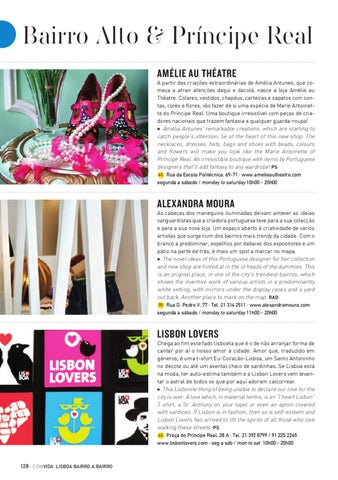 Chega ao fim este fado lisboeta que é o de não arranjar forma de cantar por aí o nosso amor à cidade. Amor que, traduzido em géneros, é uma t-shirt Eu-Coração-Lisboa, um Santo Antoninho no decote ou até um avental cheio de sardinhas. Se Lisboa está na moda, ter auto-estima também e a Lisbon Lovers vem levantar o astral de todos os que por aqui adoram calcorrear. 3 This Lisbonite thing of being unable to declare our love for the city is over. A love which, in material terms, is an “I heart Lisbon” T-shirt, a St. Anthony on your lapel or even an apron covered with sardines. If Lisbon is in fashion, then so is self-esteem and Lisbon Lovers has arrived to lift the spirits of all those who love walking these streets. PS 6C Praça do Príncipe Real, 28 A · Tel. 21 392 8799 / 91 225 2245 www.lisbonlovers.com · seg a sáb / mon to sat 10h00 - 20h00