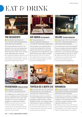 Se cruzássemos um sushimen com uma varina o resultado seria uma Peisheirada. Esta tasca alfacinha onde o atum anda enrolado com o arroz e o salmão só à chapada, é uma deliciosa confusão! 3 What do you get if you cross a sushi chef with a fishwife? Peisheirada. In other words, a Lisbon eatery with an oriental twist. This is a delicious fusion confusion. Come and try!