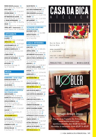 AURÉLIO RAMOS 8J R. Chagas, 17 B · 21 347 6434 BAIRRO ALTO INSTITUTO DE BELEZA 7H R. da Rosa, 14 D · T. 21 801 7610 ESPAÇO ESSÊNCIAS 4E Rua Ruben A. Leitão, 4 A Tel. 21 314 1128 / 91 255 9318 EXPRESSION 6I Cç. Combro, 55-57 · 21 343 2207 FACE OFF 7J Rua da Bica Duarte Belo, 12 Tel. 91 990 3132 FACTO BAIRRO ALTO 9I R. do Norte, 40-42 · 21 347 8821 FACTO ROYALE 4C Rua da Escola Politécnica, 53 Tel. 21 099 7701 / 91 558 5547 MANOBRAS D’ARTE 2H Cç. Estrela, 17 · 21 396 0979 PETER IN THE AIR 7D R. da Rosa, 293 · T. 91 889 7303