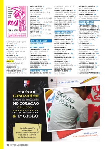 CARPE DIEM ARTE E PESQUISA 6 G Rua Século, 79 · T. 211 924 175 CASA MUSEU AMÁLIA RODRIGUES 1E Rua S. Bento, 193 · 21 397 1896 CONVENTO DOS CARDAES 6 E Rua Século, 123 · T. 21 342 7525 ESPAÇO CULTURAL MERCÊS 5 C Rua Cecílio de Sousa, 94 Tel. 96 139 1916 GALERIA BOZART 5 B Rua Escola Politécnica, 4 Tel. 21 343 2516 GALERIA DAS SALGADEIRAS 8 I R. Salgadeiras, 24 · 21 346 0881 GALERIA DE ARTE GALVEIAS 1 0 H R. Misericórdia, 83 · 21 342 2232 GALERIA DE SÃO MAMEDE 2 B Rua da Escola Politécnica, 167 Tel. 21 397 3255 GALERIA GRAÇA BRANDÃO 7 G Rua Caetanos, 26A · 91 986 4469 GALERIA JORGE E SHIRLEY 1 A Lg. Hintze Ribeiro, 2 E-F Tel. 21 386 8496 GALERIA LUÍS SERPA PROJECTOS 1B