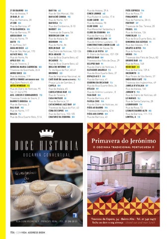 21 DO BAIRRO 8H Rua da Atalaia, 9 28 BAR, O 4E Rua da Palmeira, 28 49 ZDB 8H Rua da Barroca, 49 99 DA BARROCA 8G Rua da Barroca, 99 ADEGASBAR 9H Rua do Norte, 79 AGITO 7E R. da Rosa, 261 ÁGUA NO BICO 4D Rua de São Marçal, 170 ALFACE HALL 9G Rua do Norte, 96 APOLO XIII 8E Rua do Teixeira, 2 ARROCHA MARIA CABROCHA 8 G Travessa da Queimada, 26 A ARROZ DOCE 8G Rua da Atalaia, 119 ARTE & VINHOS ANTIQUÁRIO-BAR 7 D Rua Dom Pedro V, 63 ARTIS WINEBAR 9G Rua do Diário de Notícias, 95 Tel. 21 342 4795 ASS. LOUCOS E SONHADORES 7 D Travessa Conde de Soure, 2 BAIRRU’S BODEGA 8I Rua da Barroca, 3 BALI BAR 9G Rua do Norte, 117 BALIZA 7J Rua da Bica Duarte Belo, 51 A