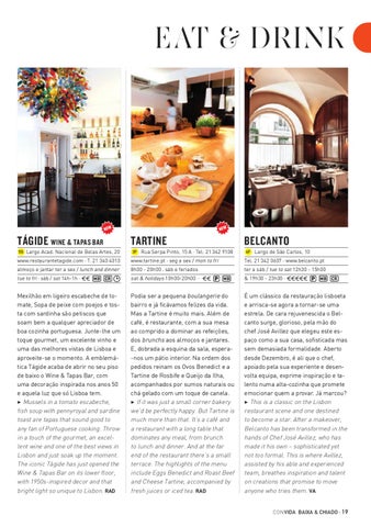 É um clássico da restauração lisboeta e arrisca-se agora a tornar-se uma estrela. De cara rejuvenescida o Belcanto surge, glorioso, pela mão do chef José Avillez que elegeu este espaço como a sua casa, sofisticada mas sem demasiada formalidade. Aberto desde Dezembro, é ali que o chef, apoiado pela sua experiente e desenvolta equipa, exprime inspiração e talento numa alta-cozinha que promete emocionar quem a provar. Já marcou? 3 This is a classic on the Lisbon restaurant scene and one destined to become a star. After a makeover, Belcanto has been transformed in the hands of Chef José Avillez, who has made it his own – sophisticated yet not too formal. This is where Avillez, assisted by his able and experienced team, breathes inspiration and talent on creations that promise to move anyone who tries them. VA CON VIDA BAIXA & CHIADO · 19