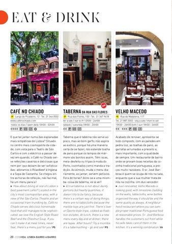 E que tal jantar numa das esplanadas mais simpáticas de Lisboa? Situado no centro mais cosmopolita da cidade, com vista para o Teatro de São Carlos e com o eléctrico a passar de vez em quando, o Café no Chiado serve refeições caseiras e deliciosas que nem por isso deixam de ser sofisticadas: adoramos o Roastbeef à Inglesa e a Sopa de Castanha. Se chegou entre as horas de refeição, não faz mal, há um menu para si! 3 How about dining at one of Lisbon’s best pavement cafés? Located in the city’s most cosmopolitan area, with a view of the São Carlos Theatre and an occasional tram trundling by, Café no Chiado serves delicious homemade food that still manages to be sophisticated: we love the English Style Roast Beef and the Chestnut Soup. If you can’t make it at meal times, never fear, there’s a menu just for you! PS 20 · CON VIDA LISBOA BAIRRO A BAIRRO