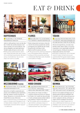 Quinoa é uma padaria biológica que se destaca pela excelente qualidade mas é também um café-restaurante para se tomar o pequeno-almoço, almoçar, ou matar a fome a qualquer hora do dia. 3 Quinoa is an organic bakery but it is also a café/restaurant where you can have breakfast, lunch, brunch or just snack on something when the urge takes you. CON VIDA BAIXA & CHIADO · 25