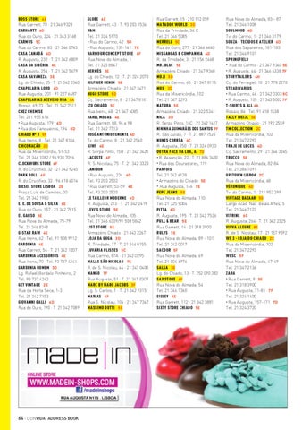 GLOBE 4E Rua Garrett, 43 · T. 93 203 1536 H&M Tel. 21 324 5170 • Rua do Carmo, 42 5D • Rua Augusta, 139-141 7E HARMOUR CONCEPT STORE 6F Rua Nova do Almada, 1 Tel. 21 325 8847 HERMÈS 3E Lg. do Chiado, 12 · T. 21 324 2070 HILFIGER DENIM 5E Armazéns Chiado · 21 347 3471 HUGO STORE 5D Cç. Sacramento, 8 · 21 347 8181 IZU CHIADO 5E Rua Ivens, 48 · 21 347 6085 JAHEL MODAS 4E Rua Garrett, 88, 94 e 98 Tel. 21 342 7713 JOSÉ ANTÓNIO TENENTE 4D Tv. do Carmo, 8 · 21 342 2560 KIWI 4E R. Serpa Pinto, 15B · 21 342 3420 LACOSTE 6F R. S. Nicolau, 75 · T. 21 342 3323 LANIDOR • Rua Augusta, 224 6D Tel. 93 203 2502 • Rua Garrett, 53-59 4E Tel. 93 203 2520 LE TAILLEUR MODERNE 6D R. Augusta, 213 · T. 21 342 2419 LEVI’S STORE 5E Rua Nova do Almada, 105 Tel. 21 346 6309/91 508 5862 LIST STORE 5E Armazéns Chiado · 21 343 2267 LOJA DA GUGA 3D R. Trindade, 17 · T. 21 346 0155 LUVARIA ULISSES 5C Rua Carmo, 87A · 21 342 0295 MALAS SÃO NICOLAU 7E R. de S. Nicolau, 44 · 21 347 0400 MANGO 7F Rua Augusta, 51 · T. 21 347 0307 MARC BY MARC JACOBS 3F Lg. S. Carlos, 1 · T. 21 342 9315 MARIAS 6F Rua S. Nicolau, 106 · 21 347 7347 MASSIMO DUTTI 5E