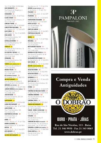 Tel. 21 342 3506 / 93 990 0844 CHEZ DEGROOTTE 3H Rua Duques de Bragança, 4 Tel. 21 347 2839 CHIMARRÃO 5E Armazéns Chiado · 21 347 9444 CLARA CHIADO 3D Lg. Rafael Bordalo Pinheiro, 27 Tel. 21 343 1267 CONCHA D’OURO 6C Rua Augusta, 238 · 21 342 8369 CONFEITARIA NACIONAL 7B Pç. Figueira, 18 · T. 21 342 4470 DAS FLORES 2G Rua Flores, 76 · Tel. 21 342 8828 DOIS ARCOS 7C Rua dos Douradores, 163 Tel. 21 887 9689 ESTRELA DO MINHO 9F Rua dos Bacalhoeiros, 137 Tel. 21 886 9626 FÁBULAS 5E Cç. Nova de São Francisco, 14 Tel. 21 601 8472 FAZ GOSTOS / DUVALE 3C Rua Nova da Trindade, 1H-K Tel. 21 347 2249 FERNANDO 10G Rua dos Bacalhoeiros, 103 Tel. 21 887 8755 FLORES (HOTEL BAIRRO ALTO) 2E Praça Luís de Camões, 8 Tel. 21 340 8252 GRANJA VELHA 7C Rua dos Douradores, 200 Tel. 21 887 3891 H3 HAMBÚRGUER GOURMET 3D R. Trindade, 13 · T. 21 380 3110 IBO RESTAURANTE 1J Cais do Sodré, Armazém A Tel. 21 342 3611 / 96 133 2024 INFUSÃO CAFÉ-CREPERIE 4C R. da Trindade, 7 · T. 96 629 1503 JARDIM MUNDIAL (HOTEL MUNDIAL) 7A Praça Martim Moniz, 2 Tel. 21 884 2000 JOÃO DO GRÃO 7C Rua dos Correeiros, 222-226 Tel. 21 342 4757 KAFFEEHAUS 4F Rua Anchieta, 3 · T. 210 956 828 LARGO RESTAURANTE 4E R. Serpa Pinto, 10A · 21 347 7225 LEÃO D’OURO 4A Rua 1º de Dezembro, 105 Tel. 21 342 6195 MARTINHO DA ARCADA 8G Terreiro do Paço, 3 Tel. 21 887 9259 MOMA 7E R. de S. Nicolau, 47 · 91 441 7536 MOURA SALÚQUIA 4B Rua do Duque, 33 · 21 342 9819 NICOLA 5B Rossio, 24-25 · Tel. 21 346 0579 OITO DEZOITO 6F R. S. Nicolau, 114 · 96 133 0226 OLIVIER RESTAURANTE 2H