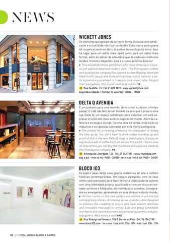 Os senhores que gostam de se vestir forma clássica com sofisticação e actualidade vão ficar contentes. Esta marca portuguesa de roupa e acessórios abriu as portas da sua flagship store. Aqui há lugar para um estilo mais sport como para um estilo mais formal, além do atelier de alfaiataria que dá corte aos melhores tecidos. Homens elegantes, este é o vosso próximo destino! 3 This will please those gentlemen who enjoy dressing in a classic yet sophisticated and modern style. This Portuguese clothes and accessories company has opened its new flagship store and filled it with casual and more formal lines, not to mention a tailoring service guaranteed to make you look impeccable. Elegant men everywhere, this is your next destination! VA 2E Rua Castilho, 13 · Tel. 21 829 7821 · www.wickettjones.com segunda a sábado / monday to saturday 10h00 - 19h30