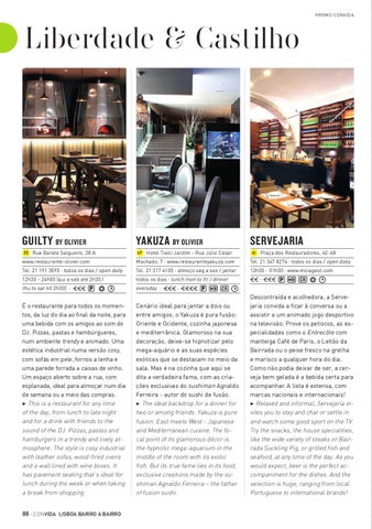 Descontraída e acolhedora, a Servejaria convida a ficar à conversa ou a assistir a um animado jogo desportivo na televisão. Prove os petiscos, as especialidades como o Entrecôte com manteiga Café de Paris, o Leitão da Bairrada ou o peixe fresco na grelha e marisco a qualquer hora do dia. Como não podia deixar de ser, a cerveja bem gelada é a bebida certa para acompanhar. A lista é extensa, com marcas nacionais e internacionais! 3 Relaxed and informal, Servejaria invites you to stay and chat or settle in and watch some good sport on the TV. Try the snacks, the house specialities, like the wide variety of steaks or Bairrada Suckling Pig, or grilled fish and seafood, at any time of the day. As you would expect, beer is the perfect accompaniment for the dishes. And the selection is huge, ranging from local Portuguese to international brands!