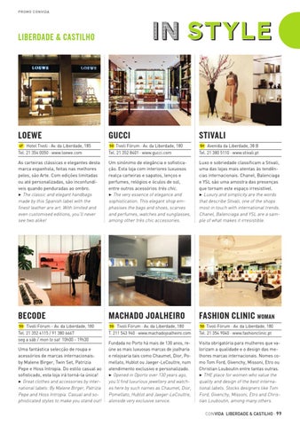 Visita obrigatória para mulheres que valorizam a qualidade e o design das melhores marcas internacionais. Nomes como Tom Ford, Givenchy, Missoni, Etro ou Christian Louboutin entre tantas outras. 3 THE place for women who value the quality and design of the best international labels. Stocks designers like Tom Ford, Givenchy, Missoni, Etro and Christian Louboutin, among many others. CON VIDA LIBERDADE & CASTILHO · 99