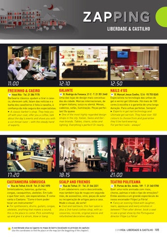 R. Rodrigo da Fonseca, 21 C · T. 21 351 2440 Uma das lojas de design mais conceituadas da cidade. Marcas internacionais, de origem italiana, suiça ou alemã. Mesas, cadeiras, sofás, iluminação. Peças perfeitas! Ou quase. 3 One of the most highly regarded design shops in the city. Italian, Swiss and German brands. Tables, chairs, sofas and lighting. Everything’s perfect! Or nearly.