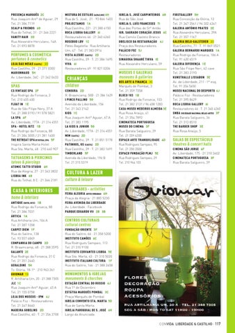 CASA & INTERIORES home & interiors ANTIQUE (HOTEL RITZ) 1B Rua Rodrigo da Fonseca, 88 Tel. 21 386 7031 ÁRTICA 1A Rua Artilharia Um, 104 A Tel. 21 387 1358 CARPET DIEM 1F Rua do Salitre, 138 Tel. 93 557 4869 COMPANHIA DO CAMPO 2D R. Braamcamp, 48 · 21 388 3595 GALANTE 2E Rua Rodrigo da Fonseca, 21 C Tel. 21 351 2440 GERALDINE 5H Tv. Glória, 18-1º · 210 963 261 GUIOMAR 1D R. Artilharia Um, 20 · 21 388 7305 JLC 1C Rua Joaquim Antº Aguiar, 45 A Tel. 21 155 0758 LOJA DOS MUSEUS - IPM 6J Palácio Foz - Restauradores Tel. 21 347 8640 MADEIRA GOBELINS 2D Rua Castilho, 40 · T. 21 356 3708