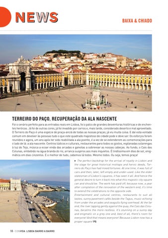 TERREIRO DO PAÇO, RECUPERAÇÃO DA ALA NASCENTE Foi o cenário perfeito para as entradas reais em Lisboa, foi o palco de grandes desventuras históricas e de enchentes heróicas. Já foi de outras cores, já foi invadido por carros e, mais tarde, considerado deserto e mal aproveitado. O Terreiro do Paço é uma espécie de praça-anciã de todas as nossas praças; já viu muita coisa. E daí esta vontade comum em devolver às pessoas tudo o que este quadrado majestoso de cidade pode e deve ser. Os esforços foram reunidos e agora, um ano após ter sido reabilitada a ala poente, é a vez de se estenderem as comemorações para o lado de lá: a ala nascente. Centros lúdicos e culturais, restaurantes para todos os gostos, esplanadas solarengas à luz do Tejo, música a ecoar vinda das arcadas e gaivotas a sobrevoar as nossas cabeças. Ao fundo, o Cais das Colunas, embebido na água branda do rio, arranca suspiros aos mais inquietos. É lindíssima em dias de sol, enigmática em dias cinzentos. E o melhor de tudo, cabemos lá todos. Mesmo todos. Ou seja, temos praça! 3 The perfect backdrop for the arrival of royalty in Lisbon and the stage for great historical mishaps and heroic deeds, Terreiro do Paço has had mixed fortunes. At one time, it was full of cars and then, later, left empty and under-used. Like the elder statesman of Lisbon's squares, it has seen it all. And hence the general desire to turn it back into what this majestic city square can and should be. The work has paid off, because now, a year after completion of the renovation of the western end, it's time to extend the celebrations to the opposite side. Entertainment and cultural centres, restaurants to suit all tastes, sunny pavement cafés beside the Tagus, music echoing from under the arcades and seagulls flying overhead. At the far end, the river lapping gently against the quay, the Cais das Colunas, becalms the more restless. It's stunning on a sunny day and enigmatic on a grey one and, best of all, there's room for everyone! And that means everyone! Because Lisbon now has a proper square! PS 10 · CON VIDA LISBOA BAIRRO A BAIRRO