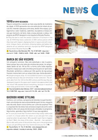 Conhece, com certeza, o programa de televisão no qual transformam uma divisão da casa surpreendendo quem lá vive, enquanto este não está. Quem nunca sonhou ser o alvo da surpresa? Pois é, a loja Querido não deixa mais ansiosos à espera da sorte e abre no Bairro Alto com peças de decoração utilizadas no programa. Veja muitos, aprenda e faça melhor! A sua casa agradece. 3 I'm sure you know that TV show where they totally redecorate a room in a house while the owner is out and give him a big surprise when he gets back. Who wouldn't want that to happen to them? Well, the shop of the show - Querido – has opened in Bairro Alto with some of the articles they use in the programme so you can get DIYing now! Your home will love you for it. PS 9i Rua do Norte, 12 · Tel. 21 324 3344 · www.alojaquerido.com segunda a sábado / monday to saturday 10h30 - 20h00