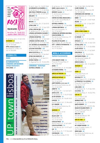Tel. 21 346 1082 / 96 930 7096 CLUBE FASHION 3 C Rua da Imprensa Nacional, 88 Tel. 707 500 083 COMPANHIA DOS SENTIDOS 4 E R. da Palmeira, 43 · 21 346 6150 DÂNDI 5 I Cç. do Combro, 87 · 21 827 9628 DELRIO 6 C R. D. Pedro V, 133 · 21 346 7297 D’ICI ET LÀ 7 D Rua D. Pedro V, 95 Tel. 21 343 1304 DIESEL STORE LISBOA 9 I Praça Luís de Camões, 30 Tel. 21 342 1980 EL DORADO 9 I R. do Norte, 23 · T. 21 342 3935 ESPAÇO B 6 C Rua D. Pedro V, 120 · 21 346 1210 FÁTIMA LOPES 8 H R. da Atalaia, 36 · T. 21 324 0550 FILIPE FAÍSCA 5 I Cç. do Combro, 95 · 21 342 0699 FUGA DÓLEO 5 I Tv. Fala-Só, 15E · 96 432 6534 GERTRUDES ÉVORA 2 F Rua Nova da Piedade, 89 Tel. 96 402 7273 GRÃO DE AREIA 5 I Cç. do Combro, 103 · 21 343 0579 INCHIADO 8 I Rua do Loreto, 32 Tel. 21 342 7513 ISABO 3 E Praça das Flores, 46 Tel. 91 915 6474 KOLOVRAT 79 7 D Rua D. Pedro V, 79 · 21 387 4536 LA PRINCESA Y LA LECHUGA 5 C Praça do Príncipe Real, 21 Tel. 96 274 1177 LENA AIRES 8 G R. da Atalaia, 96 · T. 21 346 1815 LOJA REAL 5 C Pç Príncipe Real, 21 · 96 334 7974 LOST IN 7 C Rua D. Pedro V, 58 Tel. 21 823 2605 MAOMAO SHOP 7 G R. da Rosa, 85 · Tel. 21 346 0656 MARTA BRANCO 1 E R. Sto. Amaro, 6 A · 210 991 296 MEAM BY RICARDO PRETO 5 C Praça do Príncipe Real, 21 Tel. 211 928 020 MEN SPOT 4 D Rua de São Marçal, 168 Tel. 96 357 7215 MINI BY LUNA 7 C Rua Dom Pedro V, 56 Tel. 21 346 5161 MY LISBON FASHION 9 G Largo Trindade Coelho, 17 Tel. 91 057 5500 NUNO GAMA 4 B Rua da Escola Politécnica, 46 Tel. 21 347 9068