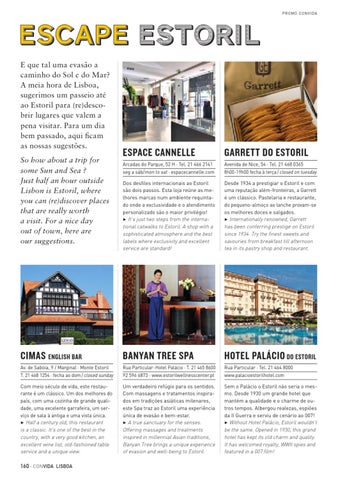 ESCAPE ESTORIL E que tal uma evasão a caminho do Sol e do Mar? A meia hora de Lisboa, sugerimos um passeio até ao Estoril para (re)descobrir lugares que valem a pena visitar. Para um dia bem passado, aqui ficam as nossas sugestões.