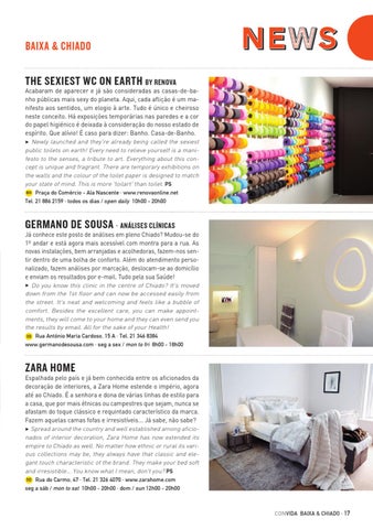 Espalhada pelo país e já bem conhecida entre os aficionados da decoração de interiores, a Zara Home estende o império, agora até ao Chiado. É a senhora e dona de várias linhas de estilo para a casa, que por mais étnicas ou campestres que sejam, nunca se afastam do toque clássico e requintado característico da marca. Fazem aquelas camas fofas e irresistíveis... Já sabe, não sabe? 3 Spread around the country and well established among aficionados of interior decoration, Zara Home has now extended its empire to Chiado as well. No matter how ethnic or rural its various collections may be, they always have that classic and elegant touch characteristic of the brand. They make your bed soft and irresistible... You know what I mean, don't you? PS 5D Rua do Carmo, 47 · Tel. 21 326 4070 · www.zarahome.com seg a sáb / mon to sat 10h00 - 20h00 · dom / sun 12h00 - 20h00