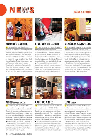 O chiado ganhou uma nova loja gourmet, um recanto recheado de produtos gastronómicos bem portugueses, descobertos de Norte a Sul do país: azeites, licores, compotas… escolha o seu pecado. 3 Chiado has inherited a new gourmet shop, a spot stuffed with Portuguese gastronomic delights from every part of the country: olive oils, liqueurs, preserves… choose whatever takes your fancy.