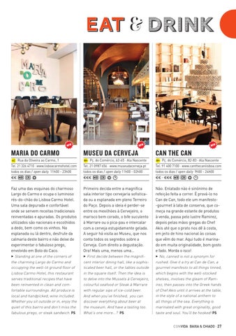 Não. Enlatado não é sinónimo de refeição feita a correr. É prová-lo no Can de Can, todo ele um manifesto-gourmet à lata de conserva, que começa na grande estante de produtos à venda, passa pelo lustre Ramirez, depois pelas mãos gregas do Chef Akis até que o prato nos dê à costa, em jeito de hino nacional às coisas que vêm do mar. Aqui tudo é marinado em muita originalidade, bom gosto e fado. Morda o isco! 3 No, canned is not a synonym for rushed. Give it a try at Can de Can, a gourmet manifesto to all things tinned, which begins with the well-stocked shelves, involves the gleam of Ramirez, then passes into the Greek hands of Chef Akis until it arrives at the table, in the style of a national anthem to all things of the sea. Everything is marinated with great originality, good taste and soul. You’ll be hooked! PS CON VIDA BAIXA & CHIADO · 27