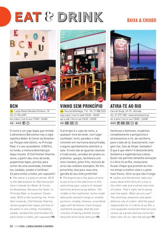 O nome é um jogo duplo que remete à abreviatura Barcelona mas a sigla significa Beber & Comer by Novamesa. Porque este último, no Príncipe Real, é o seu ascendente. O BCN é, no fundo, a mistura divertida que daqui resulta. O Chef Kishan Sharma serve, a partir das cinco da tarde, guapisimas tapas, pinchos para comer de uma assentada, montaditos, saladas, sandes e tortilhas! Es para invitar a todos, por supuesto! 3 The name is a play on words: BCN is the abbreviation for Barcelona but here it stands for Beber & Comer by Novamesa. Because the latter, in Príncipe Real, is its parent. Essentially, BCN is the resulting mix. From 5pm onwards, Chef Kishan Sharma serves guapisimas tapas, pinchos to be eaten in one sitting, montaditos, salads, sandwiches and tortillas! Es para invitar a todos, por supuesto! PS 32 · CON VIDA LISBOA BAIRRO A BAIRRO
