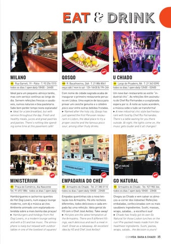 Chegou ao Chiado e vem salvar os almoços-a-correr dos lisboetas! Refeições embaladas, confeccionadas com os mais saudáveis ingredientes. Sushi, massas, wraps, saladas… a escolha é sua! 3 Chiado has finally got its own Go Natural for those Lisbon lunches on the run! Pre-packed meals made from the healthiest ingredients. Sushi, pastas, wraps, salads… the decision is yours! CON VIDA BAIXA & CHIADO · 35