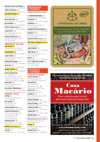GARRAFEIRAS · wine shops CAN THE CAN 8H Praça do Comércio (Terreiro do Paço), 82 · Tel. 91 400 7100 CASA MACÁRIO 6C Rua Augusta, 272 · 21 342 0900 CLARA CHIADO 3D Lg. Rafael Bordalo Pinheiro, 27 Tel. 21 343 1267 GARRAFEIRA NACIONAL 7C R. de Sta. Justa, 18 · 21 887 9004 GN CELLAR 8F R. Conceição, 26 · 21 885 2395 MANUEL TAVARES 6B Rua Betesga, 1 A-B · 21 342 4209 NAPOLEÃO WINE SHOP Tel. 21 885 2038 • Rua da Conceição, 16 9F • Rua dos Fanqueiros, 70 9F • R. da Misericórdia, 121-123 2D PORTO WINE 9G Rua dos Bacalhoeiros, 143 Tel. 96 329 0362 SALA OGIVAL / VINIPORTUGAL 7H Pç. do Comércio · T. 21 342 0690