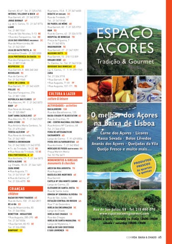 Garrett, 83-4º · Tel. 21 325 6765 INTÉRIO / VILLEROY & BOCH 4E Rua Garrett, 49 · 21 342 8739 JORGE BURNAY 4F Lg. de S. Carlos, 15 · 21 347 8774 LIANE Tel. 21 887 9261 • Rua de São Nicolau, 5-13 8E • Rua dos Fanqueiros, 146 8E LOJA DAS GRAVURAS (MOLDURAS) 2C Rua da Misericórdia, 88 Tel. 21 342 3261 LOJA DO GATO PRETO, A 5E Armazéns Chiado · 21 322 3050 LOJA PORTUGUEZA DA BAIXA 9G Rua dos Fanqueiros, 32 Tel. 21 887 3148 NESPRESSO 5E Rua Garrett, 8 · 800 260 260 NICKOLAUS 5C Rua do Carmo, 87 Tel. 21 342 9365 PARIS EM LISBOA 3E Rua Garrett, 77 · 21 342 4329 POLLUX 8C Rua dos Fanqueiros, 276 Tel. 21 881 1200 REPÚBLICA DAS FLORES 2F Rua Alecrim, 99 · T. 21 342 5073 ROOF 6F Rua Nova do Almada, 1 Tel. 21 325 8847 SANT’ANNA (AZULEJOS) 2F Rua Alecrim, 95 · T. 21 342 2537 SMEG STORE 3G Rua António Maria Cardoso, 14 Tel. 21 470 4360 TERESA ALECRIM 6F Rua Nova do Almada, 76 Tel. 21 342 1831 TORRES & BRINKMANN Tel. 21 342 5082 / 21 342 0735 • Tv. da Trindade, 18-22 3D • Rua Nova da Trindade, 1B 3E VIDA PORTUGUESA, A 4F Rua Anchieta, 11 · T. 21 346 5073 VISTA ALEGRE 3E Lg. Chiado, 18-23 · 21 346 1401 ZARA HOME • Rua Augusta, 71 Tel. 21 347 8149 7F • Rua do Carmo, 47 Tel. 21 326 4070 5D