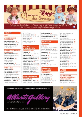 A. MOLDER 5B Rua 1º de Dezembro, 101 - 1º AFINSA PORTUGAL 7C R. de Sta. Justa, 25 · 21 882 0030 DOMINGOS SACRAMENTO HERD. 6F R. do Crucifixo, 26 · 21 342 4891 FILATELIA DO CHIADO 5C Rua do Carmo, 98 · 91 931 2324 JM BARROS RODRIGUES, HERDEIROS 4H Rua Arsenal, 80 NUMISMÁTICA DIAMANTINO 9F R. Madalena, 89 · 21 887 5113 NUMISMÁTICA VITÓRIA 6E Rua da Vitória, 87 · 21 342 0221