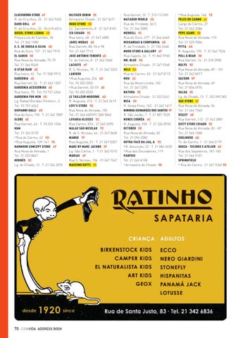 CLOCKWORK STORE 6F R. do Crucifixo, 32 · 21 342 9245 DARK DOLL 6F R. do Crucifixo, 33 · 96 618 6014 DIESEL STORE LISBOA 2E Praça Luís de Camões, 30 Tel. 21 342 1980 E. E. DE SOUSA & SILVA 6E Rua do Ouro, 157 · 21 342 7915 EL GANSO 5E Rua Nova do Almada, 75-79 Tel. 21 346 8348 G-STAR RAW 4E Rua Ivens, 62 · Tel. 91 508 9912 GARDENIA 4E Rua Garrett, 54 · T. 21 342 1207 GARDENIA ACESSÓRIOS 4E Rua Ivens, 70 · Tel. 93 737 4244 GARDENIA FOR MEN 3D Lg. Rafael Bordalo Pinheiro , 2 Tel. 93 737 4242 GIOVANNI GALLI 6D Rua do Ouro, 190 · T. 21 342 7089 GLOBE 4E Rua Garrett, 43 · T. 93 203 1536 H&M Tel. 21 324 5170 • Rua do Carmo, 42 5D • Rua Augusta, 139-141 7E HARMOUR CONCEPT STORE 6F Rua Nova do Almada, 1 Tel. 21 325 8847 HERMÈS 3E Lg. do Chiado, 12 · T. 21 324 2070