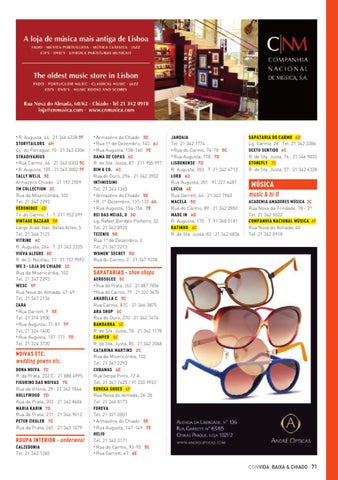 Augusta, 44 · 21 346 6338 7F STORYTAILORS 4H Cç. do Ferragial, 10 · 21 343 2306 STRADIVARIUS • Rua Carmo, 46 · 21 342 0303 5C • R. Augusta, 105 · 21 343 3002 7F TALLY WEIJL 5E Armazéns Chiado · 21 192 2559 TM COLLECTION 2C Rua da Misericórdia, 102 Tel. 21 347 2293 VÉRONIQUE 4D Tv. do Carmo, 1 · T. 211 952 299 VINTAGE BAZAAR 5G Largo Acad. Nac. Belas Artes, 5 Tel. 21 346 7123 VITRINE 6C R. Augusta, 264 · T. 21 342 2325 VIÚVA ALEGRE 8E R. de S. Nicolau, 17 · 21 157 9592 WE 3 - LOJA DO CHIADO 2C Rua da Misericórdia, 102 Tel. 21 347 2293 WESC 5F Rua Nova do Almada, 47-49 Tel. 21 347 2136 ZARA • Rua Garrett, 9 5E Tel. 21 318 3900 • Rua Augusta, 71-81 7F Tel. 21 324 1400 • Rua Augusta, 157-171 7D Tel. 21 324 3720