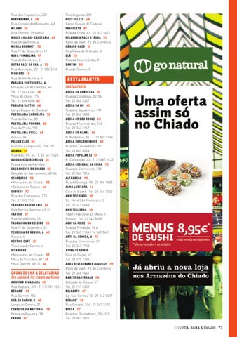 Rua dos Sapateiros, 232 MERENDINHA, A 8B Rua Condes de Monsanto, 4 A MILANO 5E Rua Garrett, 19 (pátio) MUSEU CHIADO - CAFETARIA 4G Rua Serpa Pinto, 4 NICOLA GOURMET 5B Rua 1º de Dezembro, 12 NOVA POMBALINA 9F Rua do Comércio, 2 OUTRA FACE DA LUA, A 7D Rua Assunção, 22 · 21 886 3430 P CHIADO 1E Rua da Horta Seca, 9 PADARIA PORTUGUESA, A • Praça Luís de Camões, 44 Tel. 21 342 6346 2E • Rua do Ouro, 175 Tel. 21 346 8030 6E PADARIA RATTON 4B Largo Duque de Cadaval PASTELARIA CARMELITA 5D Rua do Carmo, 88 PASTELARIA POMONA 8E Rua da Prata, 113 PASTELARIA SUIÇA 6B Rossio, 96 POLLUX CAFÉ 8C Rua dos Fanqueiros, 276 - 9º QUINOA 2F Rua Alecrim, 54 · T. 21 347 9326 QUIOSQUE DE REFRESCO 2E Praça Luís de Camões SACRAMENTO DO CHIADO 5D Calçada do Sacramento, 40-46 STARBUCKS 5E • Armazéns do Chiado 5E • Estação do Rossio 4A SUBWAY 7C Rua dos Correeiros, 173 Tel. 21 342 7101 TÁBUAS CHARCUTARIA 7A Rua Barros Queiróz, 45-51 TARTINE 3F Rua Serpa Pinto, 15 TASQUINHA DO CELEIRO 5B Rua 1º de Dezembro, 51 TENDINHA DO ROSSIO, A 6C Rossio, 6 VERTIGO CAFÉ 4D Travessa do Carmo, 4 VITAMINAS • Armazéns do Chiado 5E • Rua do Crucifixo, 81 6E • Rua Garrett, 69-71 4E
