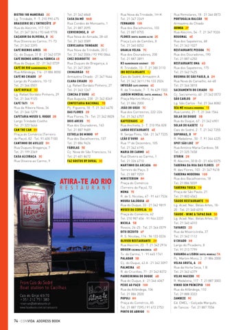 Tel. 21 342 6848 CASA DA MÓ 8AB Rua Condes de Monsanto, 1 Tel. 21 887 2095 CERVEIRENSE, O 6F Rua Nova do Almada, 38-40 Tel. 21 343 3589 CERVEJARIA TRINDADE 3C Rua Nova da Trindade, 20 C Tel. 21 342 3506 / 93 990 0844 CHEZ DEGROOTTE 3H Rua Duques de Bragança, 4 Tel. 21 347 2839 CHIMARRÃO 5E Armazéns Chiado · 21 347 9444 CLARA CHIADO 3D Lg. Rafael Bordalo Pinheiro, 27 Tel. 21 343 1267 CONCHA D’OURO 6C Rua Augusta, 238 · 21 342 8369 CONFEITARIA NACIONAL 7B Pç. Figueira, 18 · T. 21 342 4470 DAS FLORES 2G Rua Flores, 76 · Tel. 21 342 8828 DOIS ARCOS 7C Rua dos Douradores, 163 Tel. 21 887 9689 ESTRELA DO MINHO 9F Rua dos Bacalhoeiros, 137 Tel. 21 886 9626 FÁBULAS 5E Cç. Nova de São Francisco, 14 Tel. 21 601 8472 FAZ GOSTOS BY DUVAL 3C