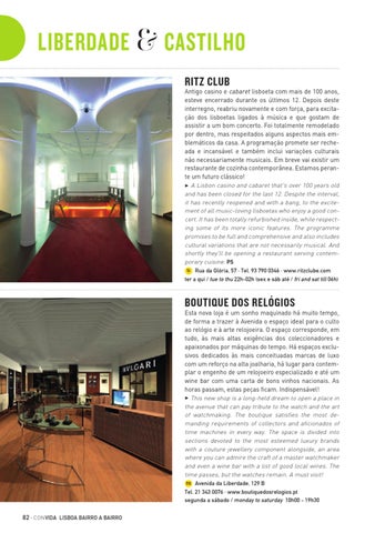 Antigo casino e cabaret lisboeta com mais de 100 anos, esteve encerrado durante os últimos 12. Depois deste interregno, reabriu novamente e com força, para excitação dos lisboetas ligados à música e que gostam de assistir a um bom concerto. Foi totalmente remodelado por dentro, mas respeitados alguns aspectos mais emblemáticos da casa. A programação promete ser recheada e incansável e também inclui variações culturais não necessariamente musicais. Em breve vai existir um restaurante de cozinha contemporânea. Estamos perante um futuro clássico! 3 A Lisbon casino and cabaret that's over 100 years old and has been closed for the last 12. Despite the interval, it has recently reopened and with a bang, to the excitement of all music-loving lisboetas who enjoy a good concert. It has been totally refurbished inside, while respecting some of its more iconic features. The programme promises to be full and comprehensive and also includes cultural variations that are not necessarily musical. And shortly they'll be opening a restaurant serving contemporary cuisine. PS 5i Rua da Glória, 57 · Tel. 93 790 0346 · www.ritzclube.com ter a qui / tue to thu 22h-02h (sex e sáb até / fri and sat till 06h)