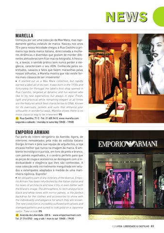 Começou por ser uma colecção da Max Mara, mas rapidamente ganhou estatuto de marca. Nasceu nos anos 70 e para nossa felicidade chegou à Rua Castilho a primeira loja desta marca italiana, direccionada a mulheres dinâmicas e divertidas que gostam de morder diferentes atmosferas sem ficar mal na fotografia. A frescura, a leveza, o sentido prático sem nunca perder a elegância, caracterizam o seu ADN. Conhecida pelos sobretudos, casacos e fatos que fazem maravilhas pelas nossas silhuetas, a Marella mostra que não existe forma mais clássica de ser irreverente! 3 It started out as a Max Mara collection, but rapidly earned a label all of its own. It was born in the 1970s and fortunately for Portugal the label's first shop opened in Rua Castilho, targeted at dynamic and fun women who like to try new experiences but always in style. Fresh, light and practical while remaining elegant at all times are the features which best characterise its DNA. Known for its overcoats, jackets and suits that enhance your silhouette in wonderful ways, Marella shows there is no more classical way to be irreverent! PS 2C Rua Castilho, 71 C · Tel. 21 405 9410. www.marella.com segunda a sábado / monday to saturday 10h00 - 19h00