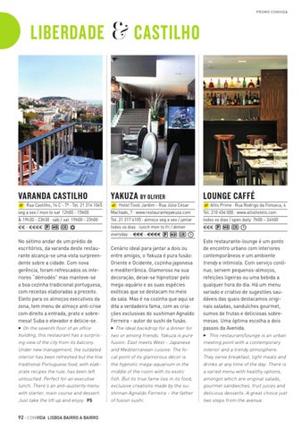 No sétimo andar de um prédio de escritórios, da varanda deste restaurante alcança-se uma vista surpreendente sobre a cidade. Com nova gerência, foram refrescados os interiores “démodés” mas manteve-se a boa cozinha tradicional portuguesa, com receitas elaboradas a preceito. Eleito para os almoços executivos da zona, tem menu de almoço anti-crise com direito a entrada, prato e sobremesa! Suba o elevador e delicie-se. 3 On the seventh floor of an office building, this restaurant has a surprising view of the city from its balcony. Under new management, the outdated interior has been refreshed but the fine traditional Portuguese food, with elaborate recipes the rule, has been left untouched. Perfect for an executive lunch. There’s an anti-austerity menu with starter, main course and dessert. Just take the lift up and enjoy. PS 92 · CON VIDA LISBOA BAIRRO A BAIRRO