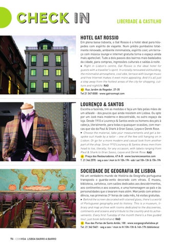 Em plena baixa lisboeta, o Gat Rossio é o hotel ideal para hóspedes com espírito de viajante. Num prédio pombalino totalmente renovado, ambiente minimalista, espírito cool, um terraço com música lounge e internet gratuita torna o espaço ainda mais apetecível. Tudo a dois passos dos bairros mais badalados da cidade, para compras, ingressões culturais e saídas à noite. 3 Right in Lisbon's centre, Gat Rossio is the ideal hotel for guests with a traveller's spirit. In a totally renovated old building, the minimalist atmosphere, cool vibe, terrace with lounge music and free Internet makes it even more appealing. And it's all just a step away from the hottest areas of the city for shopping, culture and nightlife. RAD 6J Rua Jardim do Regedor, 27-35 Tel 21 347 8300 · www.gatroomspt.com